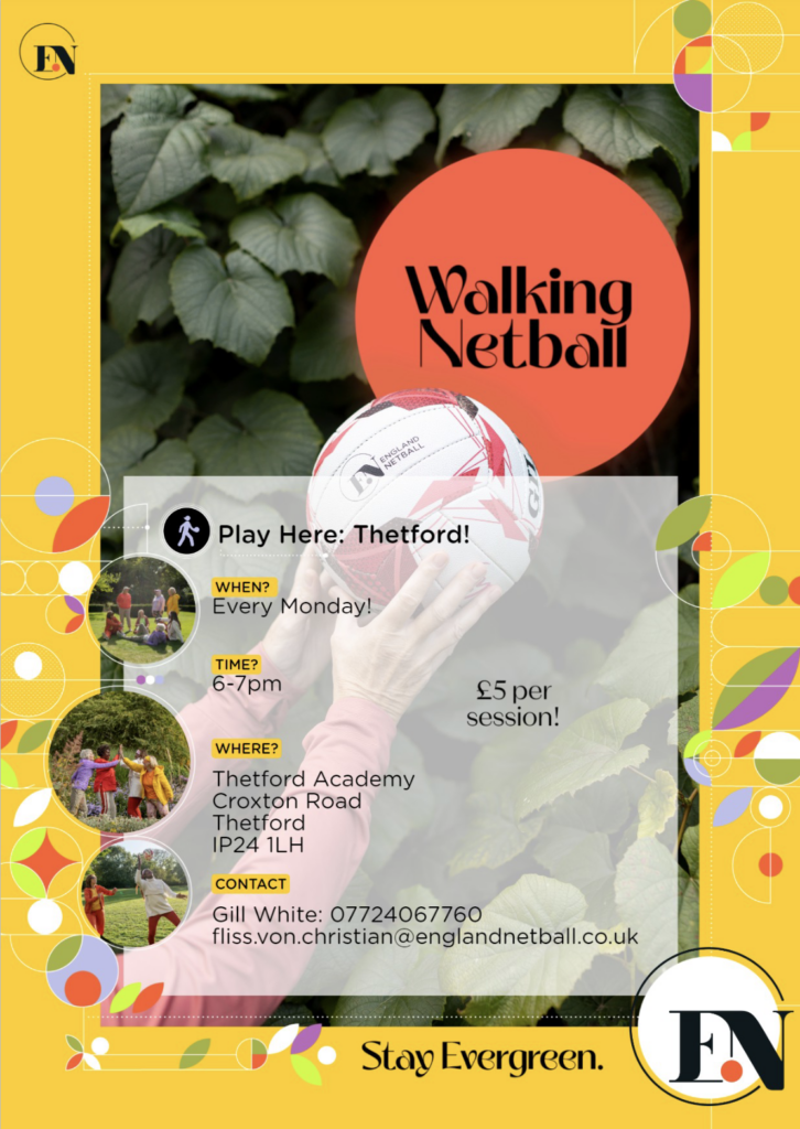 Thetford Netball Club’s Walking Netball group play together on Monday’s at Thetford Academy 6pm – 7pm.